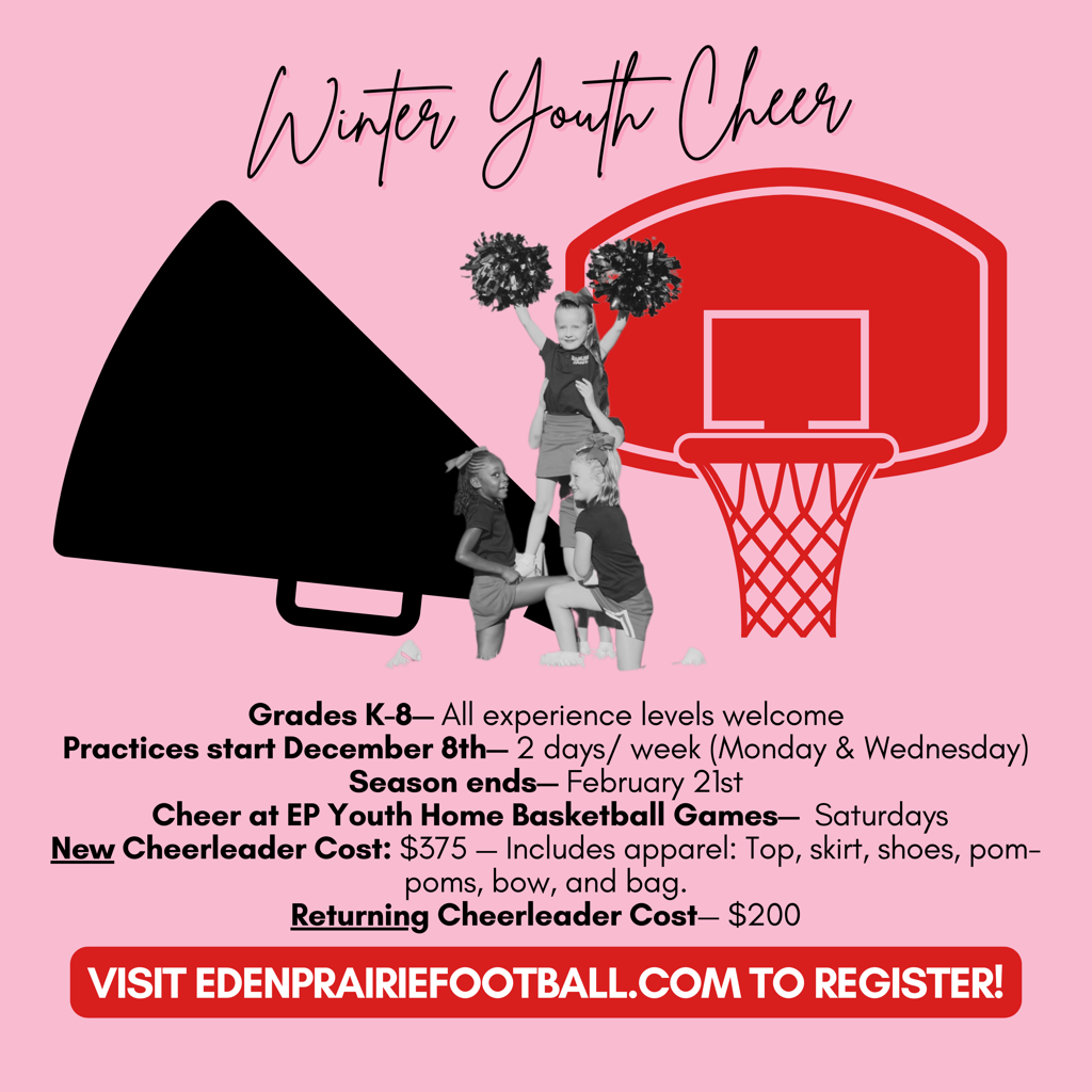 Eden Prairie Youth Cheer is a community-focused cheerleading program designed for students in grades 1-8 (as of Fall 2025). Whether your child is brand new to cheerleading or already has some experience, our program provides a supportive and exciting environment to learn and grow. Participants will practice twice a week, cheer at Eden Prairie Football Association (EPFA) home games, and develop skills in tumbling, stunting, and cheer fundamentals.